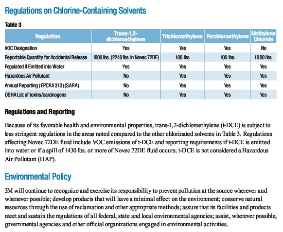 Novec 72DE fluid is ideal for a wide range of cleaning applications. It is intended to replace ozone depleting and chlorinated solvents as well as other solvent systems that do not have as favorable health, safety, or environmental properties. This? Novec product has zero ozone depletion potential and other favorable environmental properties (see Table 2). 3M Industrial Hygiene monitoring indicates there is a large margin of safety between the exposure guidelines that have been established for each of the components and exposures anticipated from intended end-use applications. The high solvency and low surface tension, nonflammability and stability of Novec 72DE fluid make it ideal for immersion and vapor degreasing applications. These properties also make the solvent ideal for certain coating and lubricant deposition applications where increased solvency is desired.